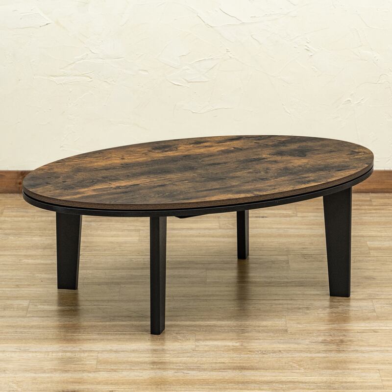 重厚なヴィンテージテイストの木目調天板が特徴のオーバル型コタツです。
